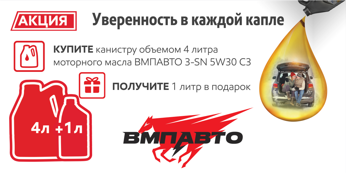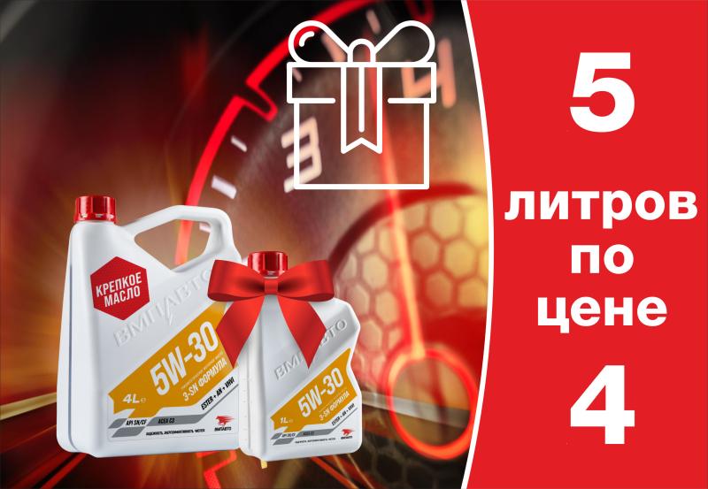 С 18 февраля по 31 марта проходит акция "4+1" на моторное масло ВМАВТО 3-SN 5W30 C3. В период акции, приобретая данный продукт в 4-х литровой канистре, Вы получаете литровую канистру в подарок! Данная акция направлена на конечного потребителя для увеличения Ваших продаж. Канистры смотаны акционным скотчем для выделения продукта на полке. Количество подарков ограниченно.