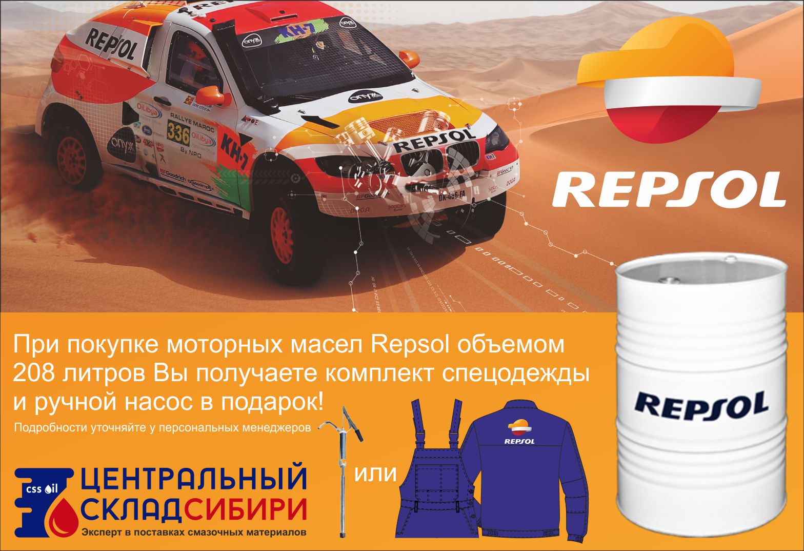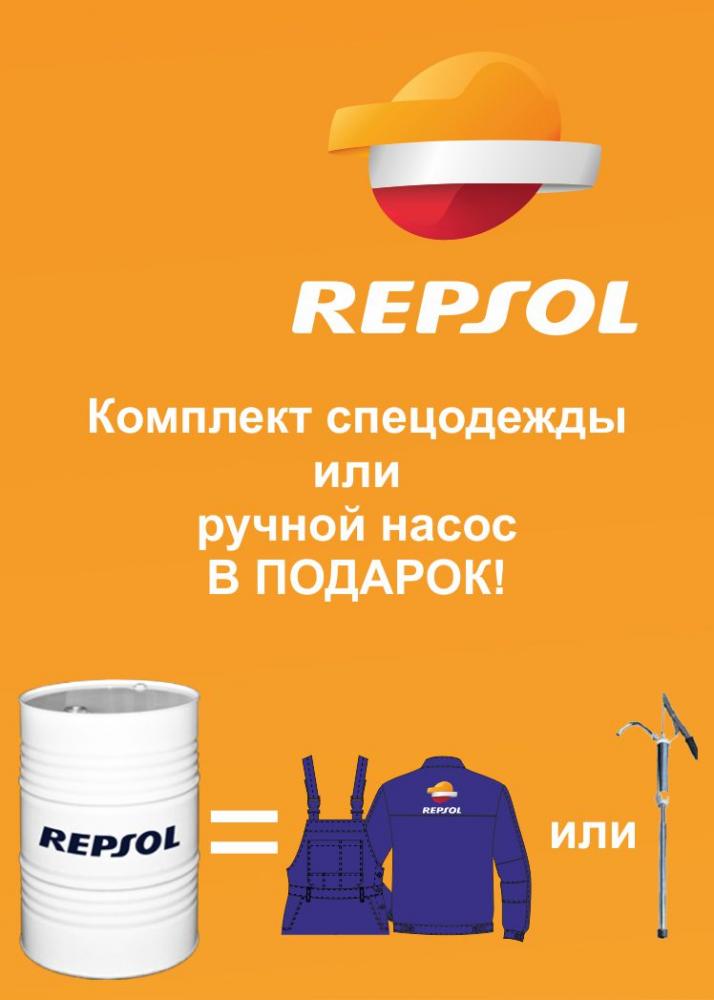 В период акции с 05.09.2022 по 30.11.2022, покупая смазочные материалы Repsol объемом более 200 литров, по итогам акции Вы получаете за каждые 200 литров 1 комплект спецодежды или 1 ручной насос для евро бочки.